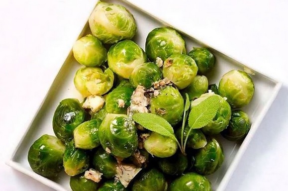 Brukselkę oczyścić i przeciąć na pół. Ugotować, a następnie przelać zimną wodą. Czosnek obrać i pokroić w cienkie plasterki. Na patelni rozgrzać tłuszcz. Wrzucić czosnek i podsmażyć na złoty kolor. Zredukować ogień i dodać brukselkę, układając je przecięciem do dołu. Wsypać rozdrobnione orzechy. Doprawić solą. Warzywa wyłożyć na talerz. Posypać świeżym pieprzem.