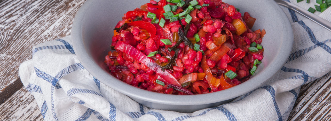 Dodać soczewicę, (wlać białe wino – opcjonalnie) i gotować przez pół minuty. Dodać połowę gorącego bulionu oraz pokrojone na plasterki buraczki (liście botwinki zachować na później), przykryć i zagotować. Gotować pod przykryciem przez ok. 20 minut.