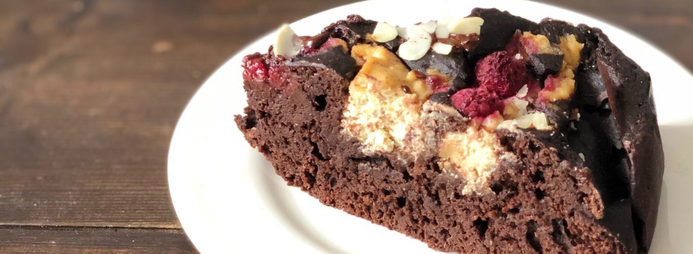 Tortownicę wyłożyć papierem do pieczenia, następnie wylać ciasto. Przygotowany już twarożek z tofu, nałożyć na ciemne ciasto a przy pomocy wykałaczki rozprowadzić masę po powierzchni ciasta rysując ósemki.